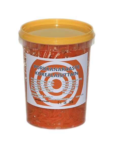 Porkkana, väkiviinaetikka, sokeri, suola, öljy, maustepippuri, korianteri, laakerinlehti, meirami, basilika, paprika, chili
