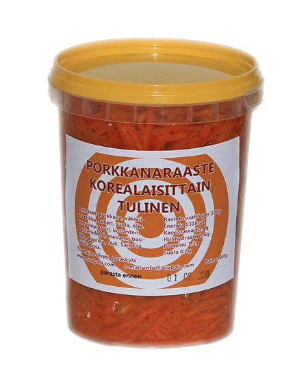 Porkkana, väkiviinaetikka, sokeri, suola, öljy, maustepippuri, korianteri, laakerinlehti, meirami, basilika, paprika, chili
